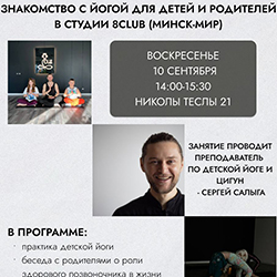 В это воскресенье (10 сентября) студия йоги и телесной терапии 8club в Минск Мире проведет бесплатное занятие для детей (7-14 лет), а также беседу с родителями в формате вопрос-ответ о роли йоги в развитии ребенка.