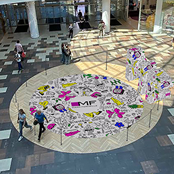 Рядом с напольной наклейкой разместится трехмерная раскраска в форме букв MF. Их высота составит 1,6 метра, а ширина – 3 метра. Когда все рисунки раскрасят, наклейка еще день будет доступна для фотосъемок.