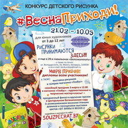 Юных художников в возрасте от 3 до 12 лет приглашают с 21 февраля по 1 марта рисовать яркие картины на весеннюю тематику. Рисунки на бумаге дети могут лично принести в ближайший павильон или передать через родителей (список павильонов, принимающих детские художественные работы, опубликован на сайте www.souzpechat.by). Важно то, что уже в момент передачи своего рисунка на конкурс, каждый ребенок получит маленький поощрительный приз-комплимент. Таким образом, проигравших в этом замечательном событии не окажется.